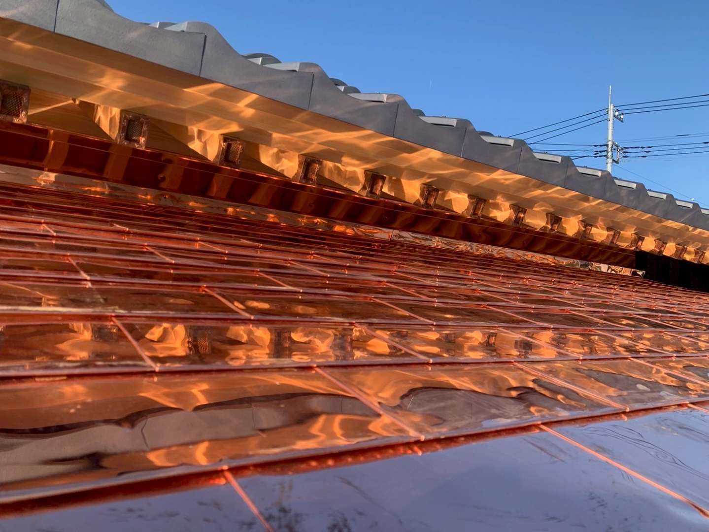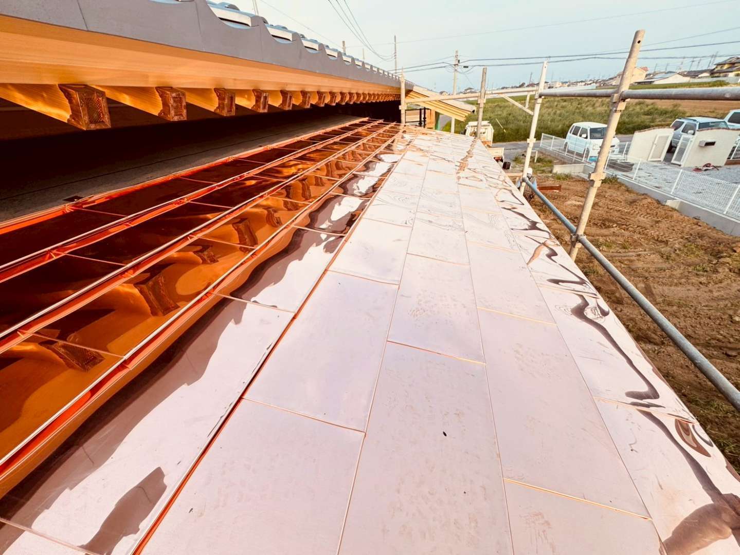 そんなお施主様の強いご要望にお応えし、有限会社牛房板金が銅板屋根の新築工事を担当いたしました。建物の和の趣に合わせ、素材には高級感と重厚感を併せ持つ純銅板を採用。屋根全体に加え、唐草や軒樋に至るまでフルオーダー加工で仕上げています。